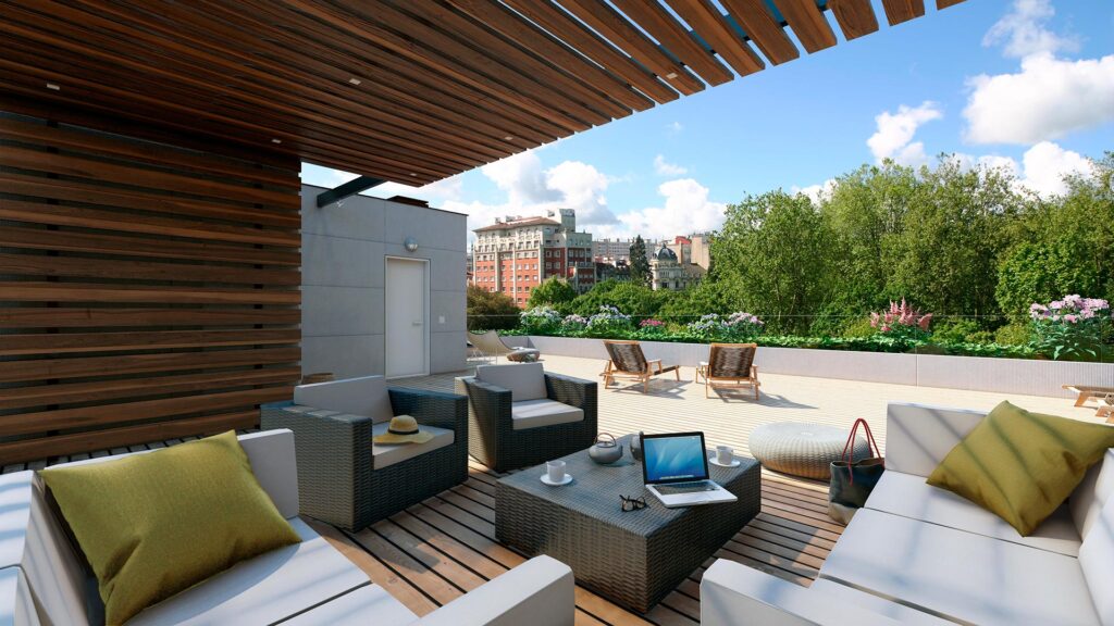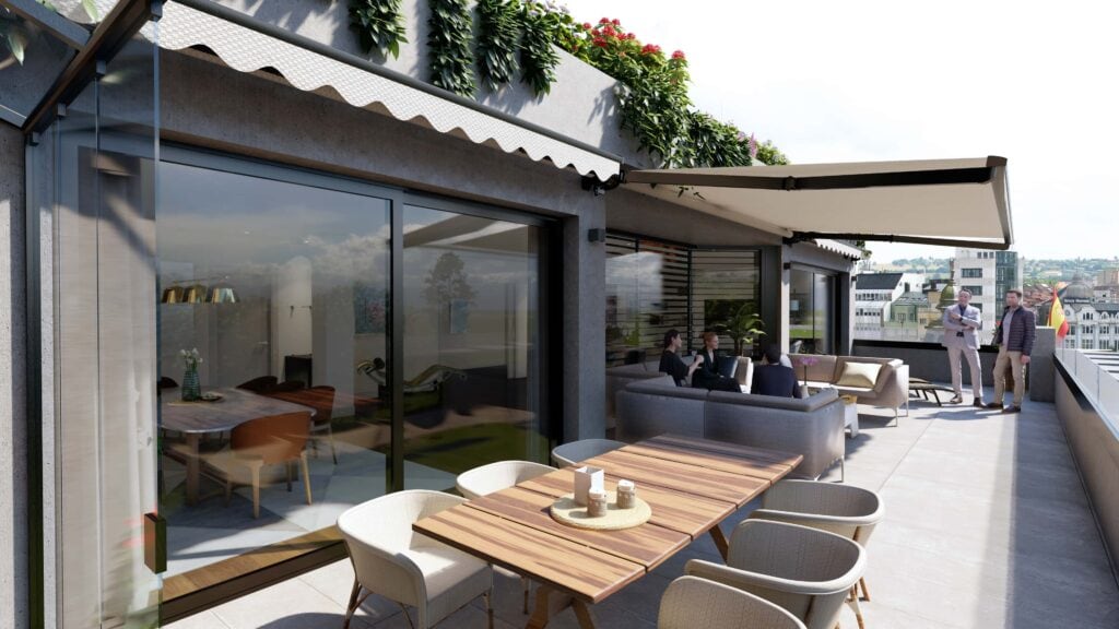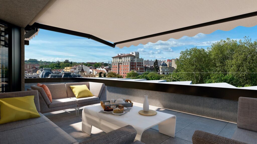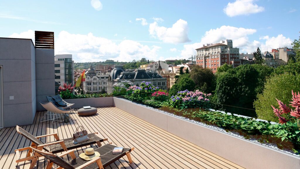 La azotea de Uría 10 es un espacio exclusivo del que podrán disfrutar los propietarios de las viviendas del edificio. Una zona común de más de 200 metros cuadrados con espacios diferenciados y vistas al Campo San Francisco, para pasar un rato tranquilo, charlar con amigos, tomar el sol, compartir en familia…